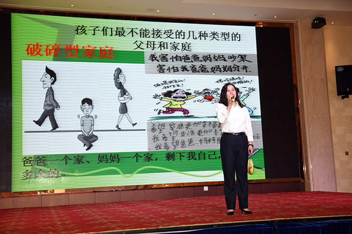 周老師本次培訓(xùn)的主題是《父母執(zhí)照—成為合格的父母》。父母作為孩子的人生啟蒙者,所擔(dān)負(fù)的教育意義不言而喻,而孩子的每個(gè)成長(zhǎng)階段都需要家長(zhǎng)積極地介入和引導(dǎo)。周老師引用了社會(huì)學(xué)家埃里克森著名的“成長(zhǎng)需要”理論闡述了孩子最重要的五個(gè)成長(zhǎng)階段,如果孩子沒(méi)有在某個(gè)階段充分成長(zhǎng),那么孩子將來(lái)的生活中就會(huì)感到困擾甚至是無(wú)能為力。如果孩子在每一階段都得到肯定和滿足,孩子的感受都能得到理解,孩子就會(huì)成為一個(gè)身心健康、接受自己的人。反之,孩子會(huì)形成反叛個(gè)性,成為人們眼中“最難教育的孩子”。周老師用通俗易懂的語(yǔ)言和形象生動(dòng)的圖片向家長(zhǎng)們呈現(xiàn)了一幕幕家庭教育案例,引導(dǎo)家長(zhǎng)正確識(shí)別和認(rèn)知家庭教育的缺失和偏頗,讓家長(zhǎng)們領(lǐng)悟正確的教育方式是孩子健康成長(zhǎng)的決定性因素。好父母是學(xué)出來(lái)的、好孩子是教出來(lái)的、好習(xí)慣是養(yǎng)出來(lái)的、好溝通是聽(tīng)出來(lái)的,和孩子建立和諧的親子關(guān)系,是靠平時(shí)在生活中一點(diǎn)一滴的累積,而不是一蹴而就的。沒(méi)有天生成功的父母,也沒(méi)有不需要學(xué)習(xí)的父母。雖然做父母的確不需要考個(gè)執(zhí)照,但是,如果不學(xué)習(xí),就不可能成為一個(gè)合格的父母!周老師用感人肺腑的語(yǔ)言,朗讀了孩子寫給家長(zhǎng)的信,深深感動(dòng)了在場(chǎng)的家長(zhǎng)們,多次熱烈的掌聲和感同身受留下的淚水把培訓(xùn)會(huì)氣氛推到了一個(gè)高點(diǎn)。