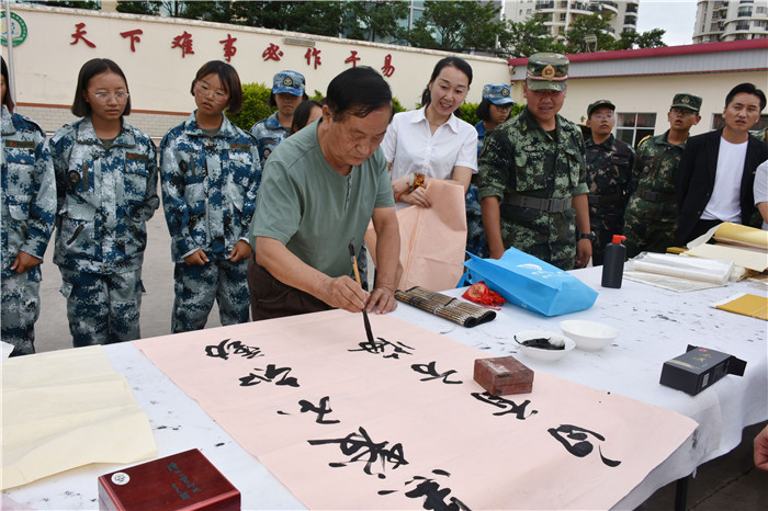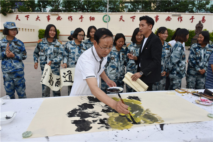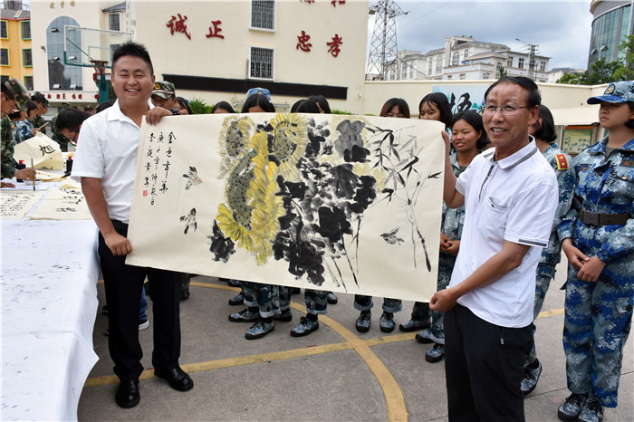 聯(lián)誼匯演結(jié)束,聽(tīng)說(shuō)老領(lǐng)導(dǎo)們都身懷絕技,在繪畫、書法上都頗有造詣,孩子們豈能錯(cuò)過(guò)這樣的好機(jī)會(huì),迫不及待地與老師一起把筆墨紙硯準(zhǔn)備好,列隊(duì)等著觀摩學(xué)習(xí)。李主任、“五老”鄧成列、徐繼泉等領(lǐng)導(dǎo)不辭辛勞,現(xiàn)場(chǎng)毫不吝嗇地?fù)]毫潑墨,只見(jiàn)筆墨飛舞間,一幅幅遒勁有力、氣勢(shì)非凡的的書法作品和活靈活現(xiàn)的《向日葵》水墨畫躍然紙上,呈現(xiàn)在大家眼前,令人賞心悅目,師生們贊不絕口,力量倍增。