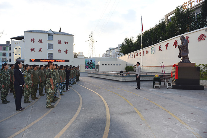 晚餐前,全體師生莊嚴(yán)地站在操場上,跟隨魯植校長一起祭拜孔子雕像。魯校長說道:“祭拜孔子雕像,不僅僅要表達(dá)對孔子的崇敬之情,更在于可以時時刻刻提醒我們要立德修身、勤而好學(xué),繼承和發(fā)揚(yáng)中華民族的優(yōu)良傳統(tǒng)。我們要以孔子的智慧和人格為標(biāo)尺,丈量每天的進(jìn)步與成長,去遇見更好的自己!痹谇f重而簡樸的儀式下,孩子們深切感受到了傳統(tǒng)文化的魅力。