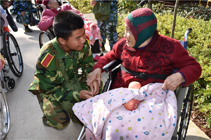 到了敬老院同學(xué)們立馬給老人們送上了蘋果,還主動(dòng)到老人身邊扶著老人散步、推著輪椅陪老人看風(fēng)景、陪老人們聊天、給老人們按摩,一張張稚嫩的笑臉和一雙雙慈祥的目光碰撞出“家”一樣的和諧、溫馨。聽說老人們喜歡看表演,孩子們就為老人們唱起了軍歌、表演了軍體拳、跳手語舞、演奏葫蘆絲等。豐富的節(jié)目博得了老人們的好評(píng),掌聲不斷響起,幾位老奶奶也開心地送上了自己的拿手表演,整個(gè)院兒里充滿了掌聲和歡笑聲。