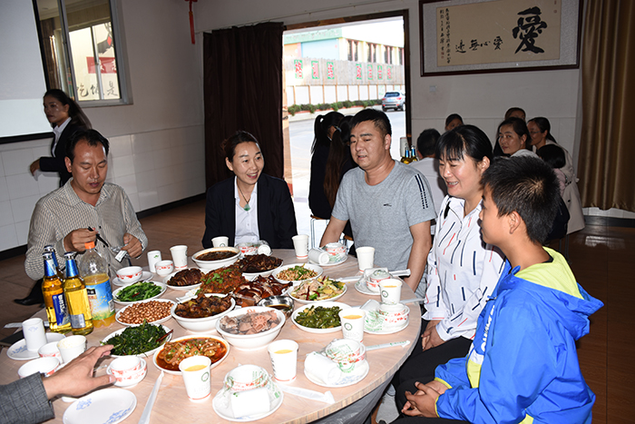 隨后,在魯校長(zhǎng)一聲“開席”的令下,大家開心地一邊品嘗著佳肴,一邊舉杯相互表達(dá)節(jié)日的祝福,只聽見一浪高過一浪的“祝爸爸媽媽中秋節(jié)快樂”、“祝全體師生中秋節(jié)快樂”的祝福響徹餐廳。席間,魯校長(zhǎng)還帶領(lǐng)校領(lǐng)導(dǎo)親切地走到孩子們中間敬茶,和大家聊家常、話祝福。當(dāng)走到學(xué)校的兩個(gè)“小不點(diǎn)”身旁時(shí),魯校長(zhǎng)情不自禁地說著“你們長(zhǎng)高了,也更懂事了”,還不時(shí)比劃著他們?nèi)胄R詠淼纳砀卟。看著教學(xué)中嚴(yán)厲的校長(zhǎng),生活中卻是如此關(guān)切地噓寒問暖、和藹可親,像父母,又像兄長(zhǎng),也像朋友,同學(xué)們頓時(shí)覺得非常溫暖。