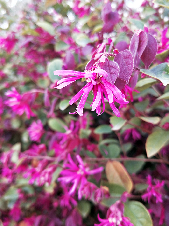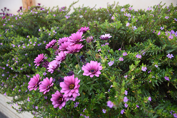非洲雛菊最先吹響了春天的號角,攜來一抹春意。幾棵粉的,因為陽光青睞,恩澤也多一些,開得熱烈奔放;幾棵白的,因為高棵的遮擋,就略顯矜持,輕啟朱唇,似笑還羞的樣子;而就數(shù)紫的,在浩蕩春風的吹拂下,都欣欣然睜開了眼,伸著懶腰,迫不及待的嶄露頭角。
