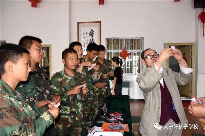 結(jié)合活動(dòng)主題,耿老從簡(jiǎn)單的剪“紅五星”及“法”字著手,再增加難度到“!薄ⅰ皣帧、“蜻蜓”等圖案,不厭其煩地講解折紙、裁剪角度等要領(lǐng)。同學(xué)們上下翻折著手中的彩紙,時(shí)而低頭思索,時(shí)而拿起來(lái)認(rèn)真對(duì)照?qǐng)D樣,神情十分專注。在耿老的精心指導(dǎo)下,同學(xué)們一折、一剪、一展,剪紙仿佛有魔法一般,一個(gè)個(gè)栩栩如生的作品便躍然眼前,在場(chǎng)的人無(wú)不發(fā)出聲聲驚嘆。耿老還現(xiàn)場(chǎng)把孩子們裁剪的作品塑封好,分發(fā)給他們。孩子們拿著自己的“杰作”,紛紛拍照留念,舉在頭頂?shù)摹胺ā弊郑渤闪舜舜位顒?dòng)的點(diǎn)睛之筆。
