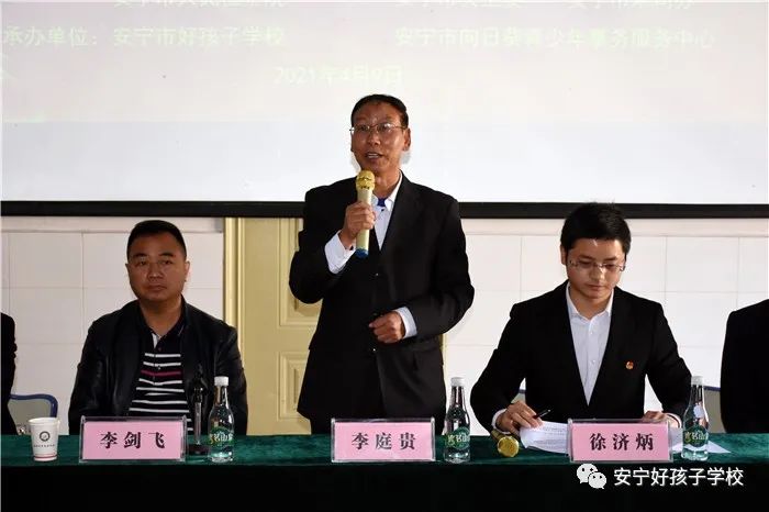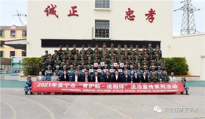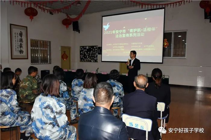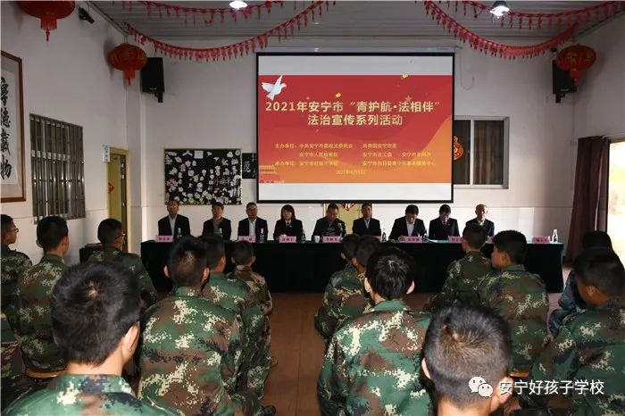 為加強青少年法治教育和思想道德教育,預(yù)防和減少未成年人違法犯罪,提高未成年人自我保護(hù)能力,推進(jìn)依法治市,建設(shè)平安安寧, 2021年4月9日上午, 由市委政法委、共青團(tuán)安寧市委、市人民檢察院、市關(guān)工委、市未司辦主辦,安寧市向日葵青少年事務(wù)服務(wù)中心、安寧好孩子學(xué)校承辦的“青護(hù)航•法相伴”法治宣傳系列活動在我校多功能室舉行。市委政法委副書記李劍飛、市人民檢察院第四檢察部主任孫曉宇、市關(guān)工委專職副主任李庭貴、團(tuán)市委副書記徐濟(jì)炳、市人民檢察院和市關(guān)工委部分“五老”成員等領(lǐng)導(dǎo)出席了本次活動;顒佑蓤F(tuán)市委副書記徐濟(jì)炳主持。