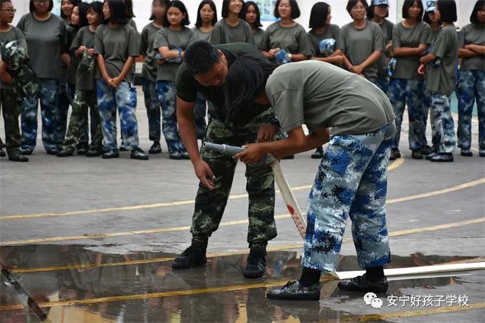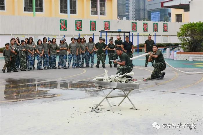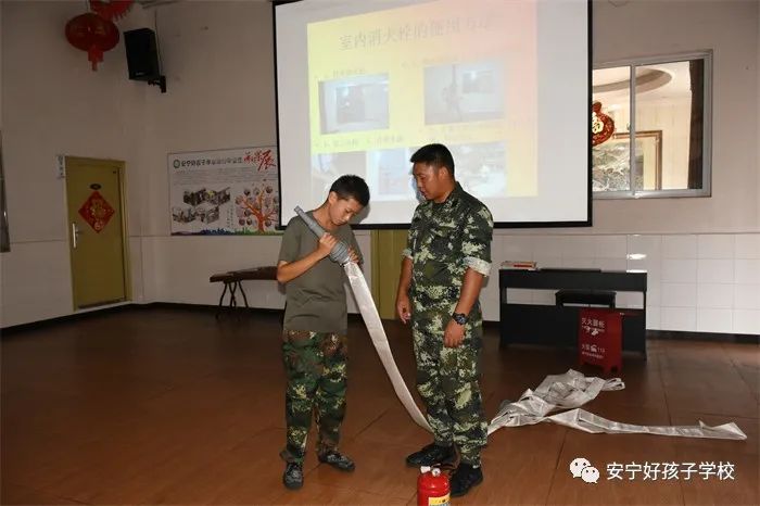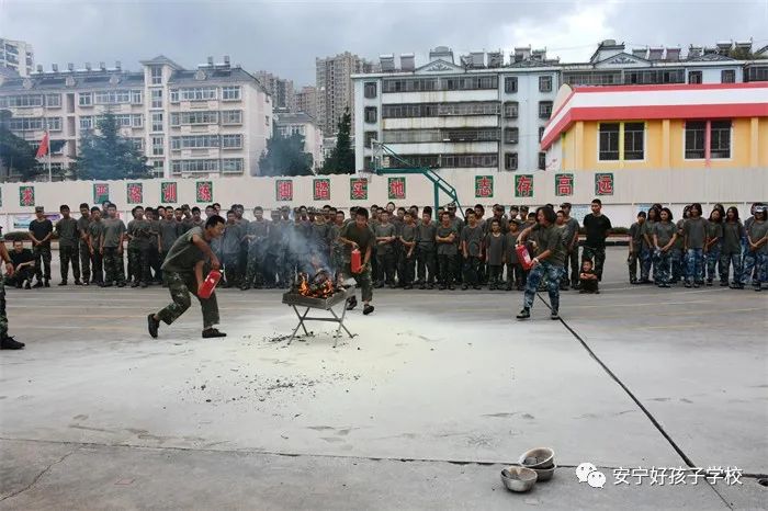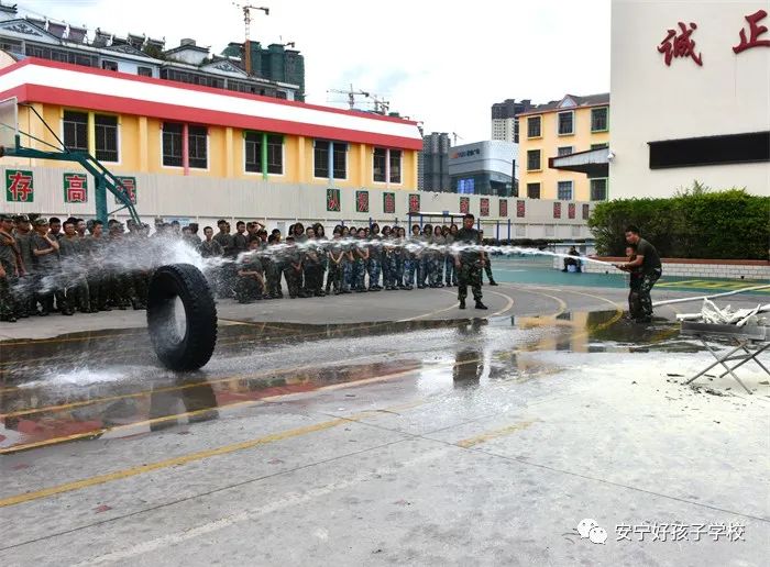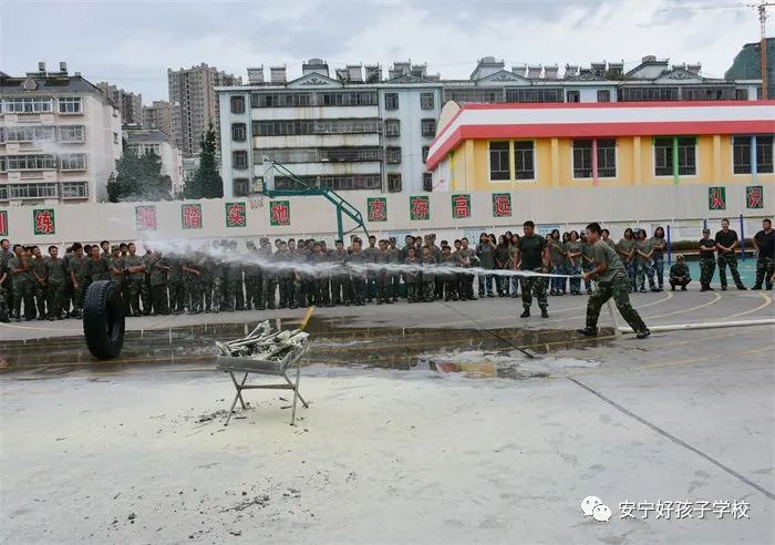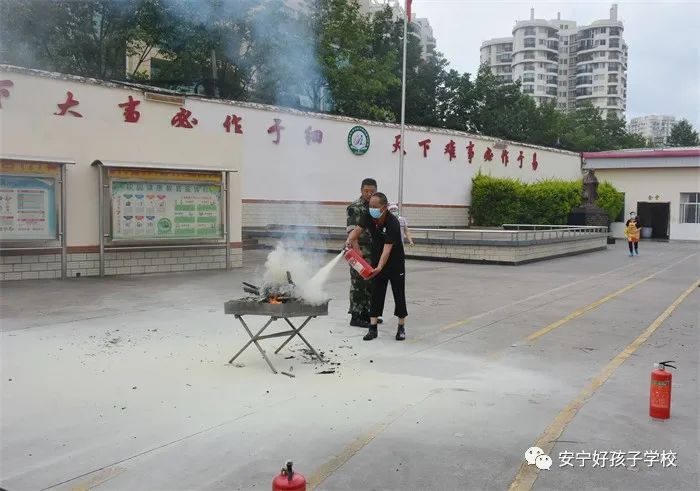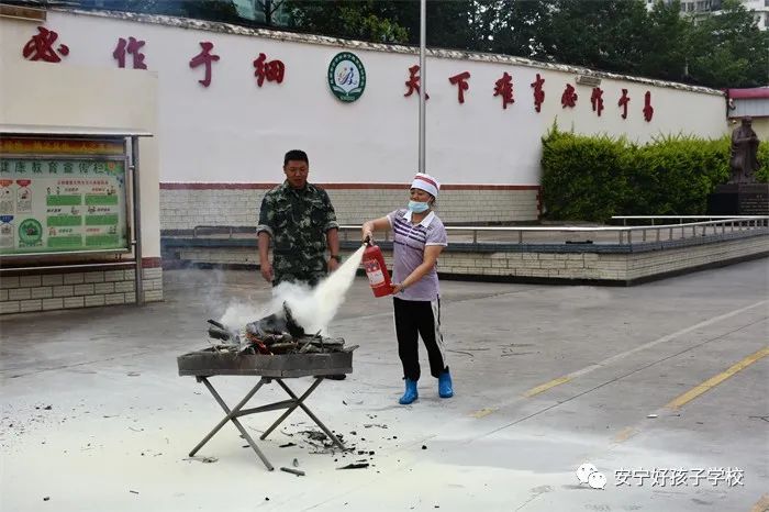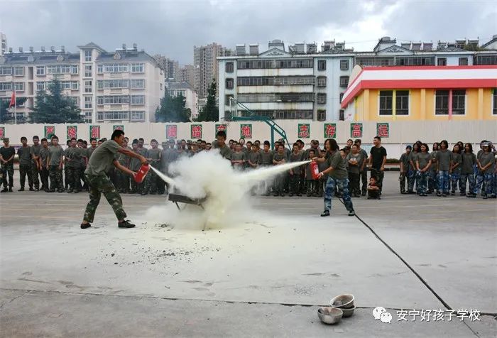 最后,進(jìn)行了撲救演練。操場上的木材點(diǎn)燃后,火苗迅速變成了熊熊大火,老師開始現(xiàn)場演示滅火設(shè)備(滅火器、高壓水槍)的使用方法,并指導(dǎo)全部學(xué)生親自操作演練。