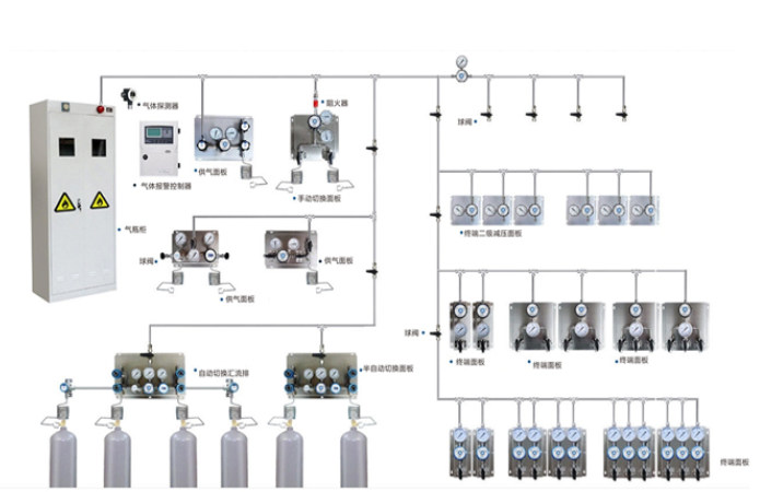 獨立氣瓶間:氫氣等易燃氣體需單獨設置氣瓶間,配備防爆電氣、通風系統(tǒng)(換氣次數≥3次/小時)及氣體泄漏報警裝置(氫氣報警閾值1%LEL)。