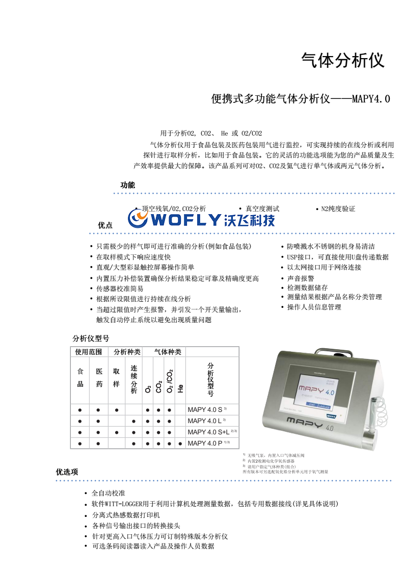 全自動(dòng)校準(zhǔn)軟件WITT-LOGGER用于利用計(jì)算機(jī)處理測(cè)量數(shù)據(jù),包括專(zhuān)用數(shù)據(jù)接線(詳見(jiàn)具體說(shuō)明)分離式熱感數(shù)據(jù)打印機(jī)各種信號(hào)輸出接口的轉(zhuǎn)換接頭針對(duì)更高入口氣體壓力可訂制特殊版本分析儀便攜式多功能氣體分析儀——MAPY4.0