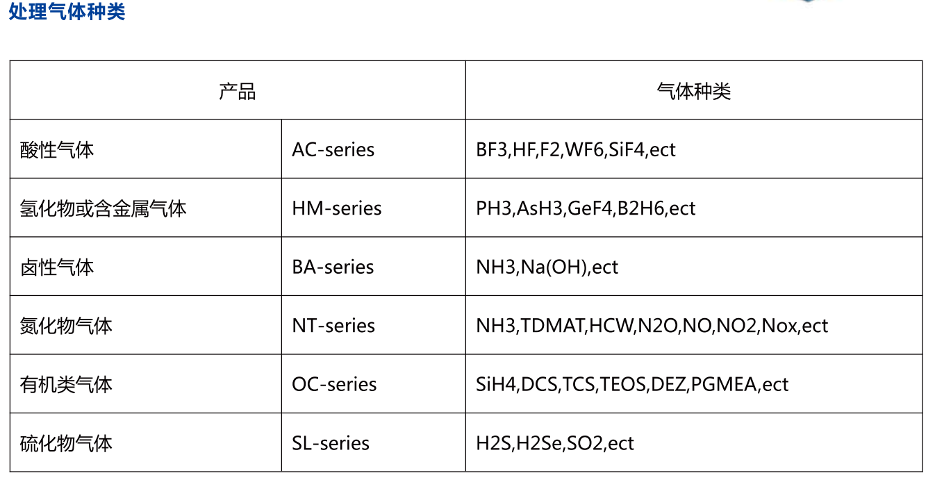WFS-100F吸附式local scrubber 尾氣處理設(shè)備可處理氣體種類包括半導(dǎo)體、液晶以及太陽(yáng)能等行業(yè)中蝕刻制程與化學(xué)氣相沉積制程中使用的特氣,主要包括SiH4、SiH2Cl2、PH3、B2H6、TEOS、H2、CO、NF3、SF6、C2F6、WF6、NH3、N2O等。
