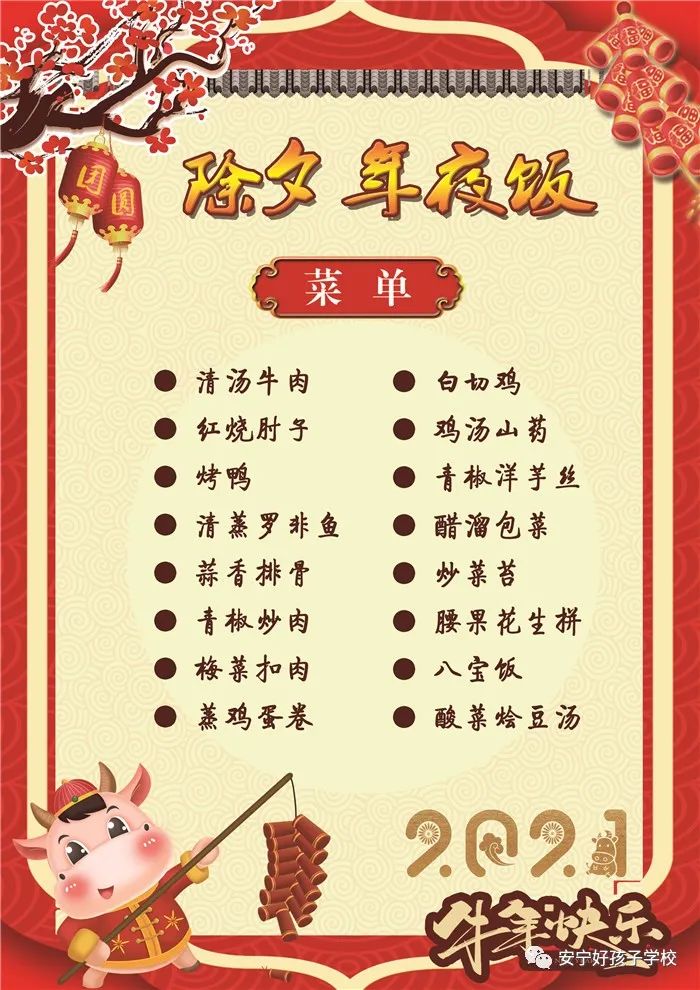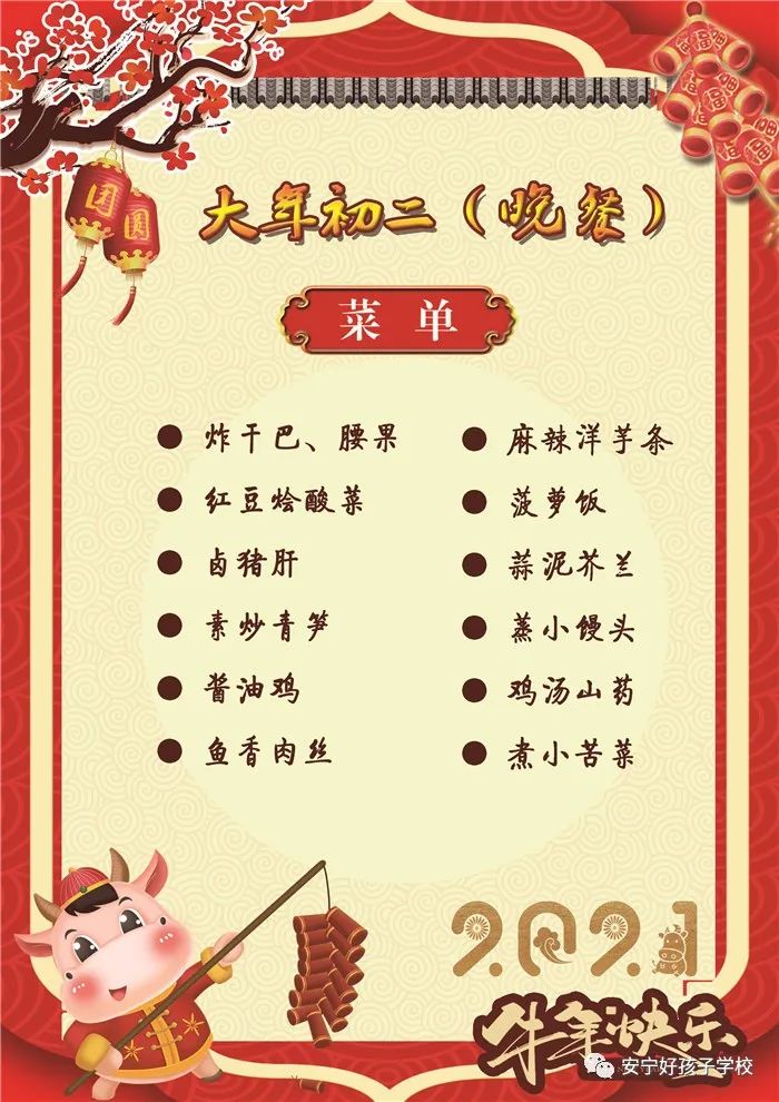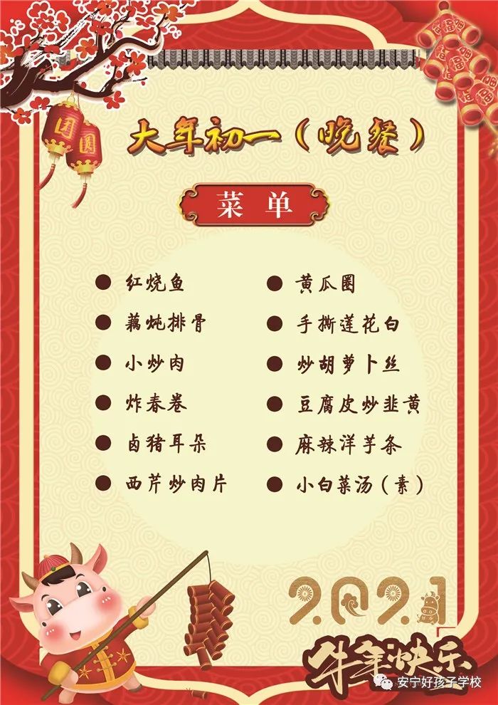 過年了 !孩子們吃什么?這是學(xué)校領(lǐng)導(dǎo)幾天來一直思考的問題。經(jīng)過與學(xué)校營養(yǎng)師、食堂廚師們多次商議后,本著營養(yǎng)、健康、不浪費(fèi),又要保證孩子每餐都能吃上新鮮可口的飯菜,終于議定了菜單,現(xiàn)予以公布。祝孩子們新年快樂!祝全體家長萬事如意!
