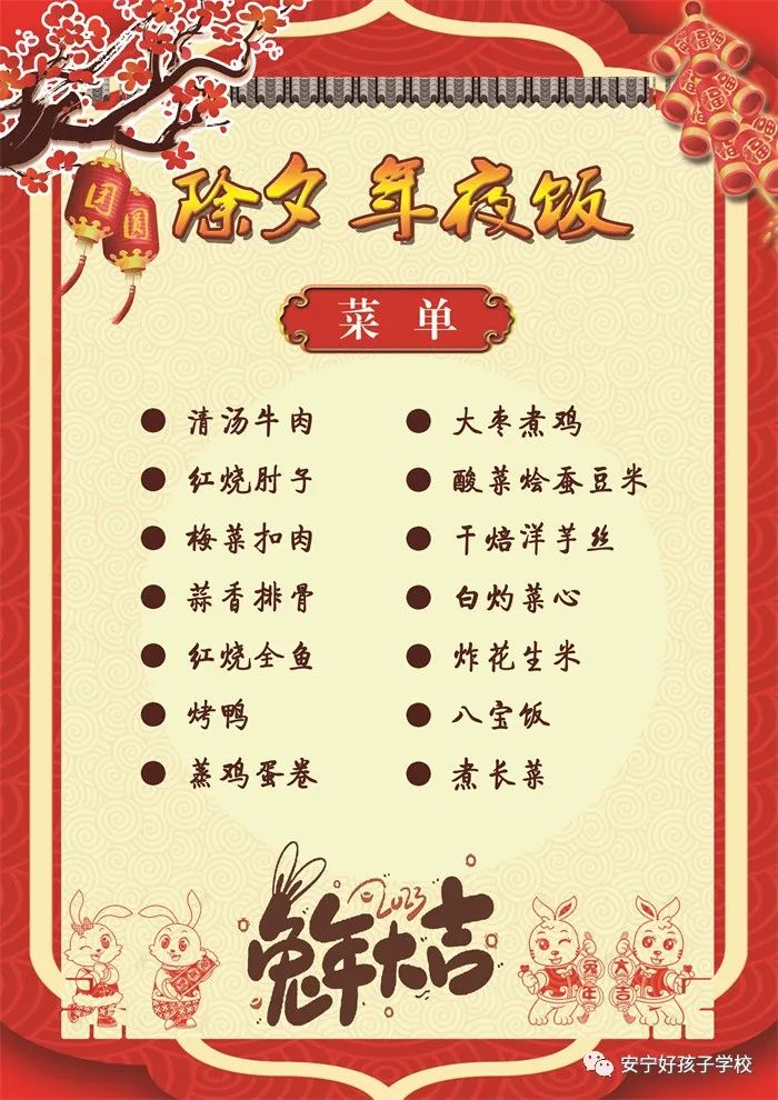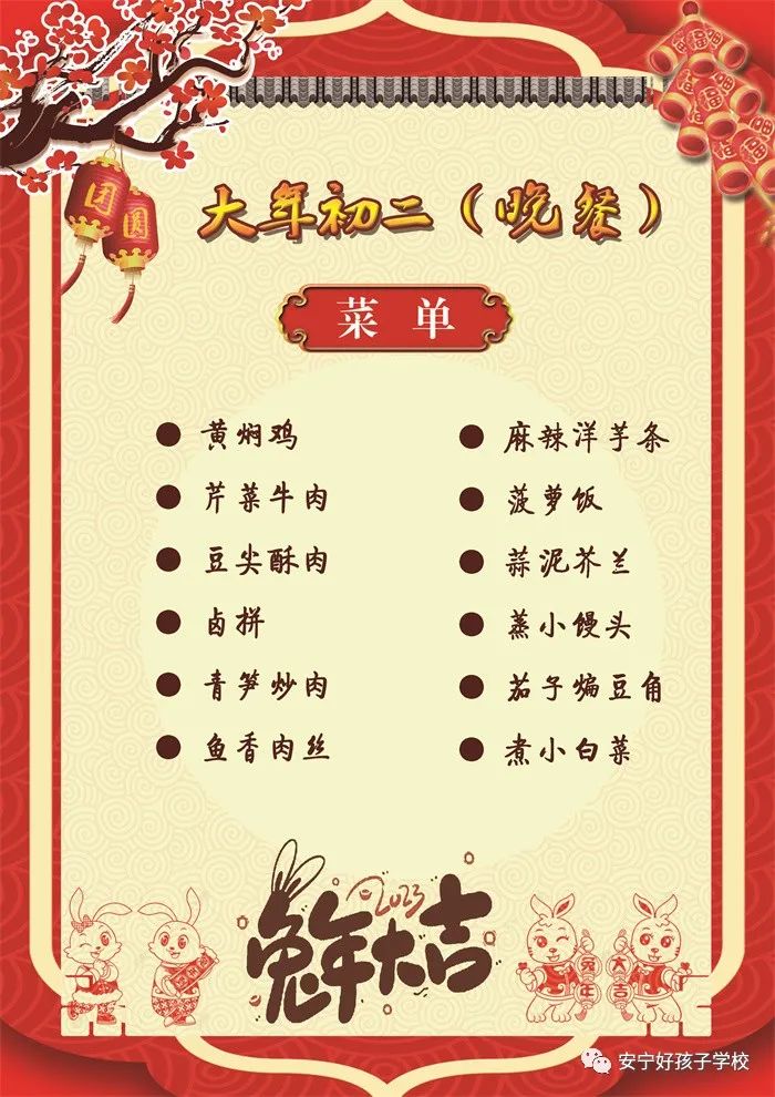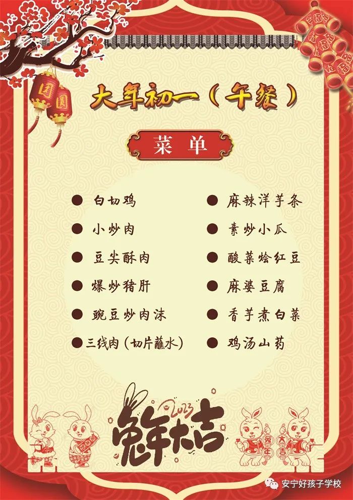 過年了 !孩子們吃什么?這是學(xué)校領(lǐng)導(dǎo)幾天來一直思考的問題。經(jīng)過與學(xué)校營養(yǎng)師、食堂廚師們多次商議后,本著營養(yǎng)、健康、不浪費(fèi),又要保證孩子每餐都能吃上新鮮可口的飯菜,終于議定了菜單,現(xiàn)予以公布。祝孩子們新年快樂!祝全體家長兔年吉祥、闔家幸福安康!