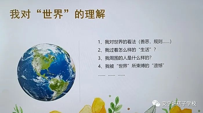 課程伊始,趙老師用熱身小游戲活躍課堂氣氛,調(diào)動(dòng)同學(xué)們的積極性,讓同學(xué)們用最自然的狀態(tài),投入到課堂學(xué)習(xí)中。隨后,趙老師揭開了今天與同學(xué)們探討的話題“在世界眼里,我是怎樣一個(gè)人”。趙老師以“關(guān)于‘我’的問題、我對‘世界’的理解、以及‘世界’之于我”等話題讓孩子們進(jìn)行自我探索。