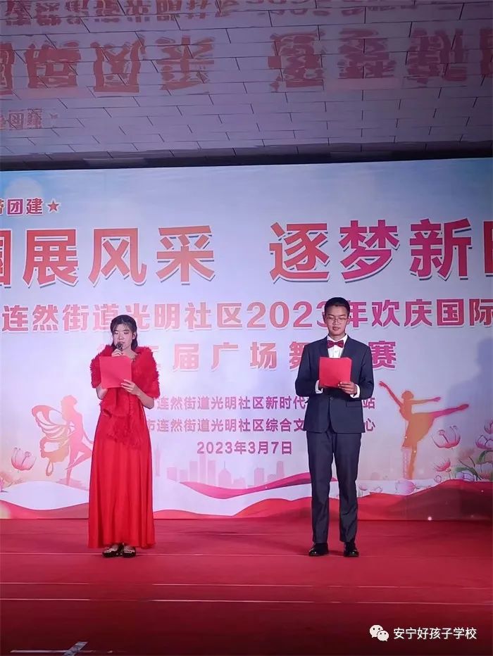 2023年3月7日晚,我校組織部分學生參加了安寧市連然街道光明社區(qū)舉辦的“巾幗展風采 逐夢新時代”2023年歡慶國際婦女節(jié)暨第二屆廣場舞大賽活動;顒釉谖倚擅≈鞒秩藷崆檠笠绲慕榻B和觀眾們熱烈的掌聲中拉開帷幕。