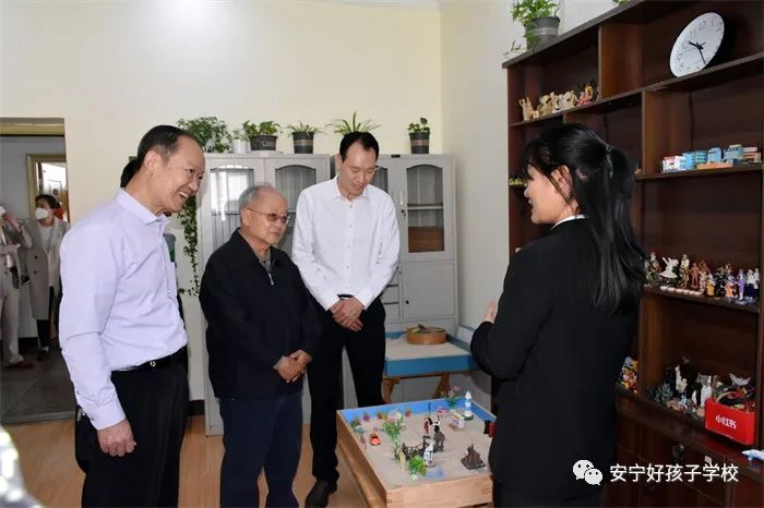 老省長(zhǎng)懷著對(duì)學(xué)校的關(guān)心、關(guān)切之情,親切地走進(jìn)學(xué)校的辦公區(qū)、教學(xué)區(qū)、生活區(qū)等全面查看。在走訪心理輔導(dǎo)室時(shí),老省長(zhǎng)駐足良久,饒有興致地和我校心理教研組長(zhǎng)趙松瑞(國(guó)家二級(jí)心理咨詢師)做了深入的交流,趙老師還現(xiàn)場(chǎng)解讀了幾個(gè)沙盤的案例。隨后,在多媒體教室觀看了學(xué)校教學(xué)活動(dòng)短片,全方位、深層次地了解學(xué)校。其間,魯校長(zhǎng)就學(xué)校的辦學(xué)定位、發(fā)展理念、辦學(xué)特色、安全管理、辦學(xué)成績(jī)等逐一向老省長(zhǎng)作了匯報(bào)。