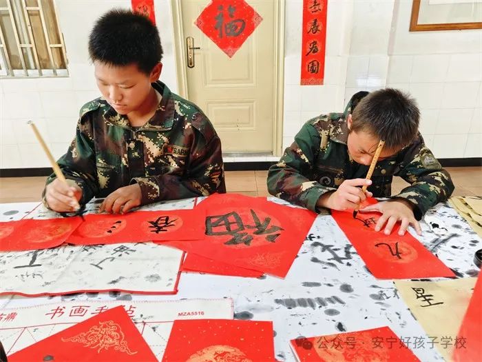 在窗明幾凈的多功能室里,翰墨飄香,福氣滿堂,孩子們徜徉其中,用心地選聯句、飽蘸濃墨、潤圓筆鋒、提筆揮毫。經過2個多小時的奮筆疾書,孩子們都完成了屬于自己的春聯作品!按号R大地花開早,福滿人間喜事多”“日麗神州彩鳳舞,霞飛華夏巨龍騰”“天地人四海同春,松竹梅三陽開泰”“一帆風順年年好,萬事如意步步高”等滿載祝福的春聯躍然紙上。隸書的有折無轉、楷書的齊而不拘、草書的筆畫連綿、行書的悠游流轉......大家筆走龍蛇,作品行云流水,都肆意地將心底最美好的祝愿化作一幅幅寓意吉祥的作品,在漢字的線條美與結構美之中傳遞著濃郁的辭舊迎新、接福納祥的新春祝福。