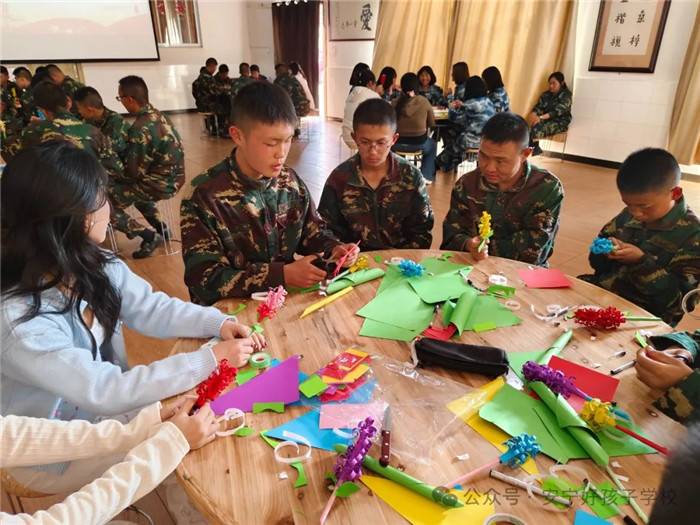 在志愿者們的悉心指導(dǎo)下,同學(xué)們迫不及待開始嘗試,全身心投入,每一步都制作得特別認真,遇到不會的,立馬請教,相互學(xué)習(xí),互相探討。一剪一粘,一扭一捏,一卷一折,一拼一插,花朵的雛形初現(xiàn)!盎ㄟ呉睚R一點,不能太緊,松一點可以讓花瓣顯得更有活力!敝驹刚邆儾粫r在旁邊指導(dǎo)著。不一會兒,只見孩子們喜笑顏開,七嘴八舌地說道:“我會了我會了,接下來我要換一種顏色做一朵更漂亮的花”“我覺得你這朵小的就很不錯,紫色的真好看,花小小的也很秀氣,我就喜歡小花”“沒想到這不起眼的小紙片,還能做出如此漂亮的花束” ......孩子們就這樣你一言我一語的交流著。