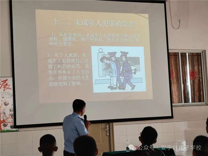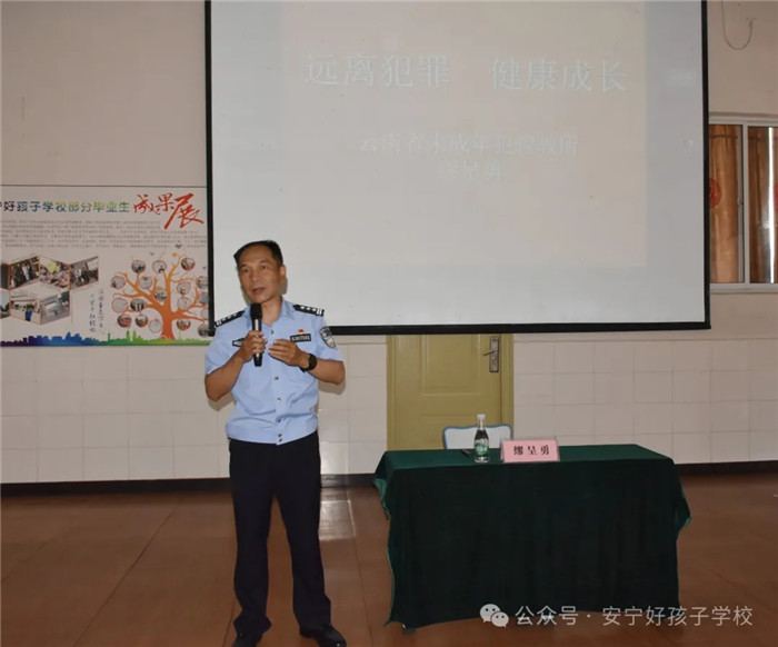為進一步強化未成年人法治宣傳教育的針對性、實效性,切實增強青少年的法律意識和自我保護能力,著力打造平安、文明、和諧的校園環(huán)境。2024年4月12日,我校特邀云南省未成年犯管教所繆呈勇警官到校為全體師生開展了一堂以“遠離犯罪  健康成長”為主題的法治教育講座。