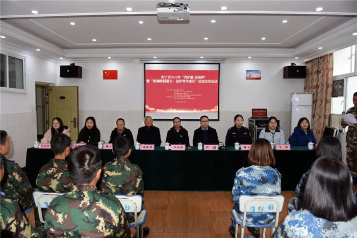 為深化校園法治安全教育,引導未成年人養(yǎng)成遵紀守法的行為習慣,提高未成年人法治意識,預(yù)防和減少未成年人違法犯罪,創(chuàng)建健康安全的校園環(huán)境。2024年11月28日,由共青團安寧市委、市關(guān)工委、市未司辦、云南省未成年犯管教所主辦,安寧市向日葵青少年事務(wù)服務(wù)中心與我校承辦的安寧市2024年“青護航·法相伴”暨“抵制校園暴力,法護青年成長”法治宣傳活動在我校舉行。安寧市關(guān)工委常務(wù)副主任李庭貴,安寧市關(guān)工委“五老”代表鄧成列、楊云生,云南省未成年犯管教所警官林子毓等領(lǐng)導出席了本次活動。