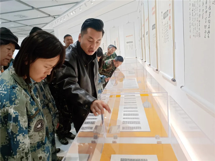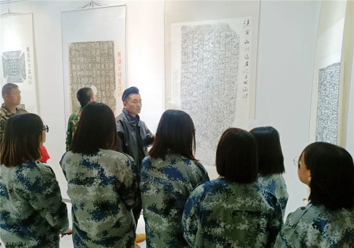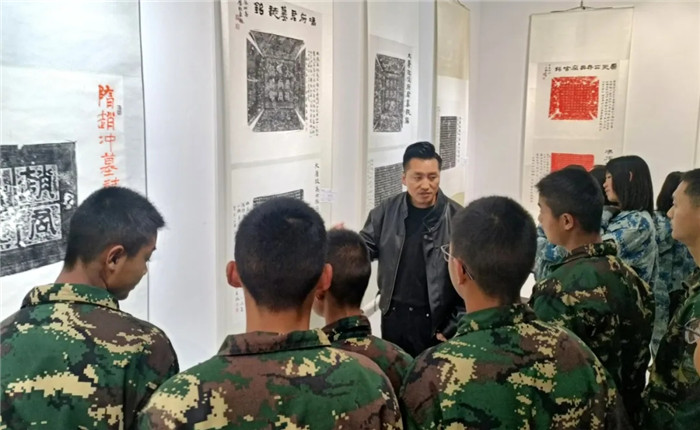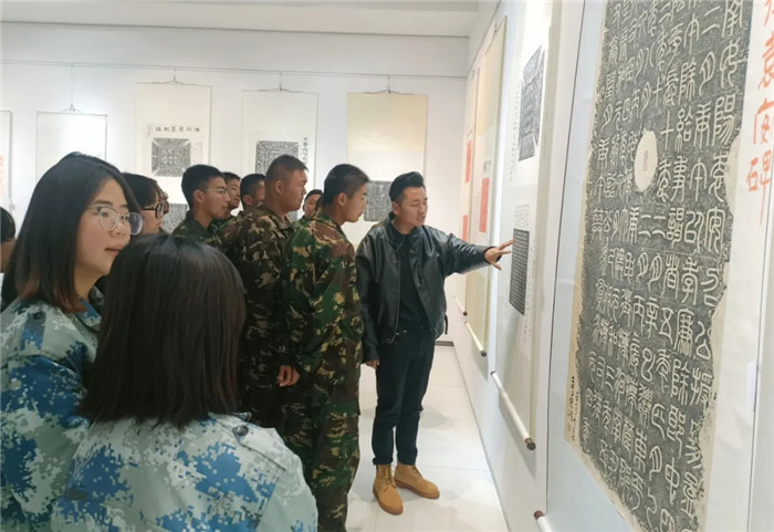 展覽突破傳統(tǒng)范式,兩位書法家創(chuàng)造性運用“拓片為經(jīng),題跋為緯”的展陳邏輯,以篆、隸、楷、行、草不同書體題寫跋文,既有魏碑雄強筆勢與粗獷拓痕的張力碰撞,也不乏娟秀小楷與細膩紋飾的和諧共生。通過章法疏密、墨色濃淡的匠心,為師生呈現(xiàn)了一場跨越千年的文化盛宴,讓師生在斑駁的拓片肌理間遇見文明密碼,于翰墨丹青間傳承文化基因,感受“一紙拓千秋”的文化魅力。